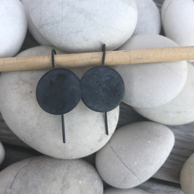 Runda cirkelörhängen med krok, gjorda av oxiderat sterlingsilver.